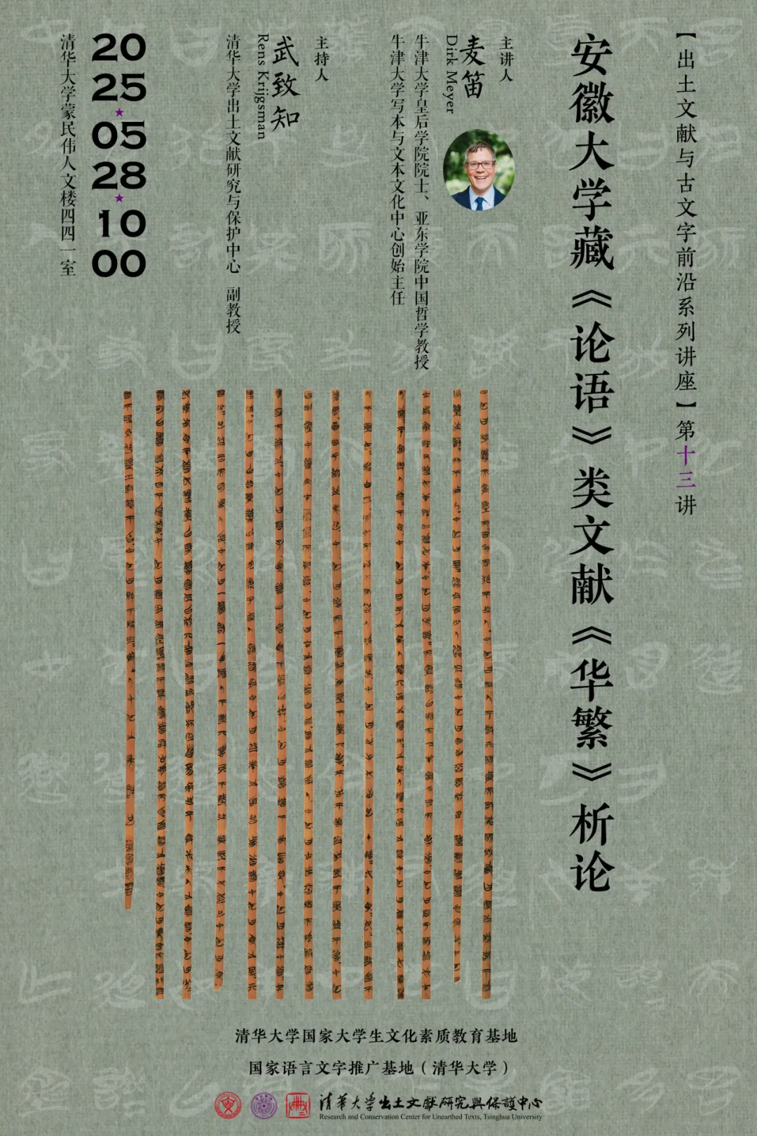 5月28日上午,牛津大学皇后学院院士、亚东学院中国哲学教授、牛津大学写本与文本文化中心创始主任麦笛(Dirk Meyer)应邀作了题为“安徽大学藏《论语》类文献《华繁》析论”的精彩讲座。本次讲座是“出土文献与古文字前沿系列讲座”的第十三场,由清华大学出土文献研究与保护中心副教授武致知(Rens Krijgsman)主持。