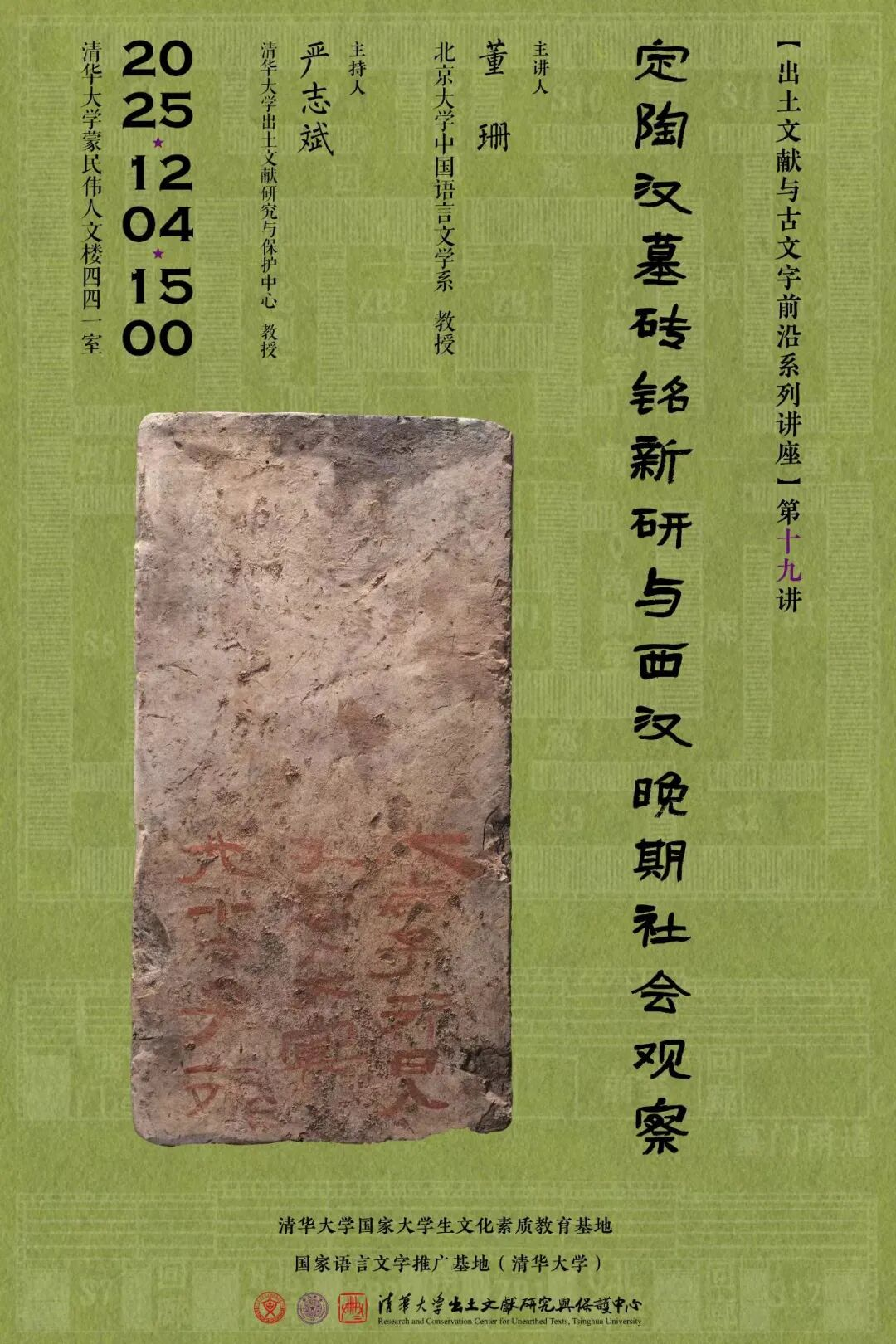 12月5日下午,北京大学中国语言文学系董珊教授应邀来到清华大学出土文献研究与保护中心,作了题为“定陶汉墓砖铭新研与西汉晚期社会观察”的精彩讲座。本次讲座是“出土文献与古文字前沿系列讲座”第十九讲,由出土文献中心严志斌教授主持。