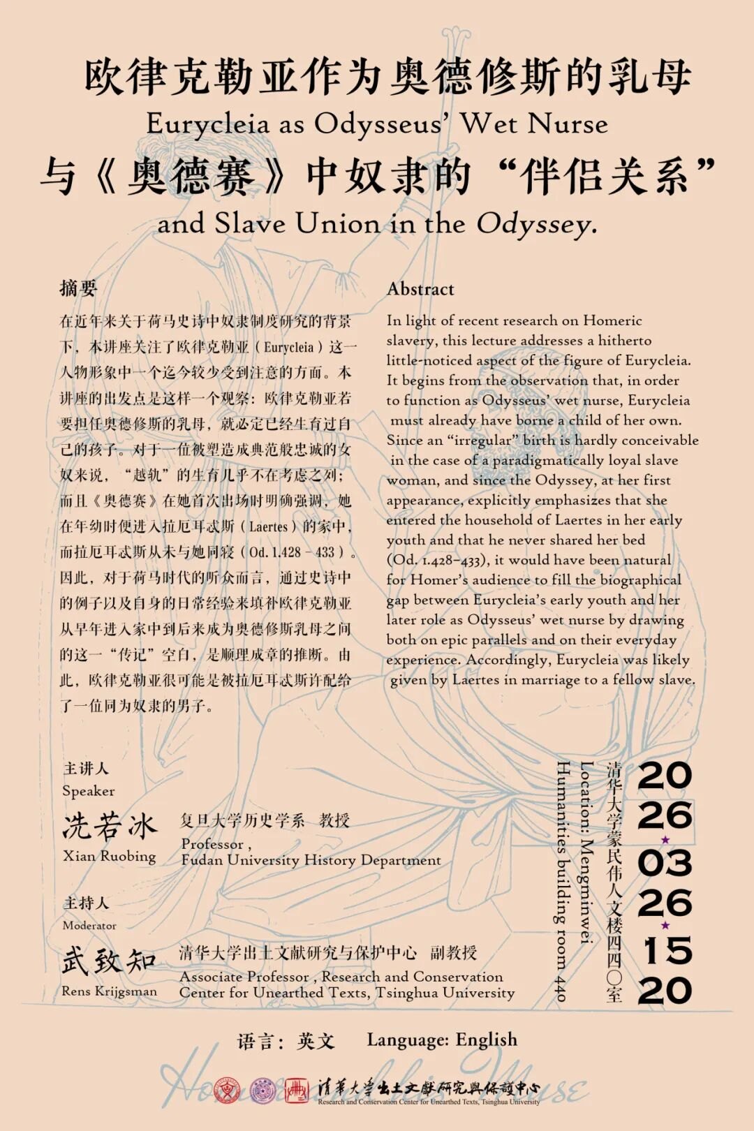 在近年来关于荷马史诗中奴隶制度研究的背景下,本讲座关注了欧律克勒亚(Eurycleia)这一人物形象中一个迄今较少受到注意的方面。本讲座的出发点是这样一个观察:欧律克勒亚若要担任奥德修斯的乳母,就必定已经生育过自己的孩子。对于一位被塑造成典范般忠诚的女奴来说,“越轨”的生育几乎不在考虑之列;而且《奥德赛》在她首次出场时明确强调,她在年幼时便进入拉厄耳忒斯(Laertes)的家中,而拉厄耳忒斯从未与她同寝(Od. 1.428–433)。因此,对于荷马时代的听众而言,通过史诗中的例子以及自身的日常经验来填补欧律克勒亚从早年进入家中到后来成为奥德修斯乳母之间的这一“传记”空白,是顺理成章的推断。由此,欧律克勒亚很可能是被拉厄耳忒斯许配给了一位同为奴隶的男子。